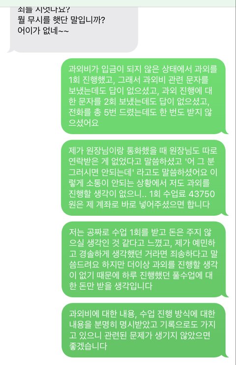 10월 13일 수요일에 직접 학생의 집에 방문해서 어머니께 제가 과외하는 방식, 구상한 커리큘럼, 횟수 등등에 대해 충분히 설명을 드렸습니다. 어머니께서는 최대한 과외를 빨리 진행하고 싶다고 하셔서 10월 18일 월요일부터 과외를 진행하게 되었습니다. 첫 수업이기 때문에 더 신경써서 준비를 했고 10분을 초과해서 대략 100분 가량의 수업을 했습니다. 수업이 끝나고 과외비를 아직 받지 않은 게 생각 나서, 바로 수업료를 넣어달라는 문자를 보냈습니다. 하지만 그 문자에는 답이 없으셨습니다.