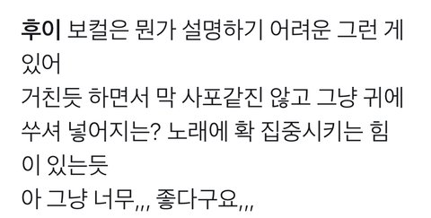 밑에 메보즈 목소리글보고 평소에 궁금하던건데 후이 보컬이 어떤지 똑똑이 유니가 글로 풀어서 설명해줄수 있을까?? 난 그냥 사이다보컬이다밖에…….
