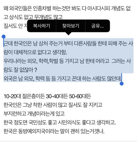 웃기시네ㅋㅋㅋ 지금 미국사는데 한국인한테 제일 싸가지없는게 한국인임 특히 장사하는것들 극혐이야 뒤에서 말 만들어내고 까는것도 한국인만한 인종이 없다 해외에서 같은 동포끼리 돕고 의지?? 한국인들은 그런거 없어 누구 잘되면 끌어내리기 바쁘지