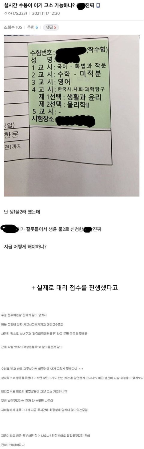 수능 접수하는 기간이 2주가 넘는데 그 기간 내내 뭐하다가 수능 전날에야 확인을 하는거지? 수능 접수하면 접수증 주고, 그 접수증에 내가 어떤 과목을 보는지 적혀 있음. 자기가 사정사정해서 대리 접수를 한거면 제대로 확인을 했어야지. 수능 접수 기간이면 과목 변경도 가능하구만. 자기 일을 남에게 미뤄놓고 잘못되니 남탓하는 게으름과 인성으론 뭘 해도 망할듯.