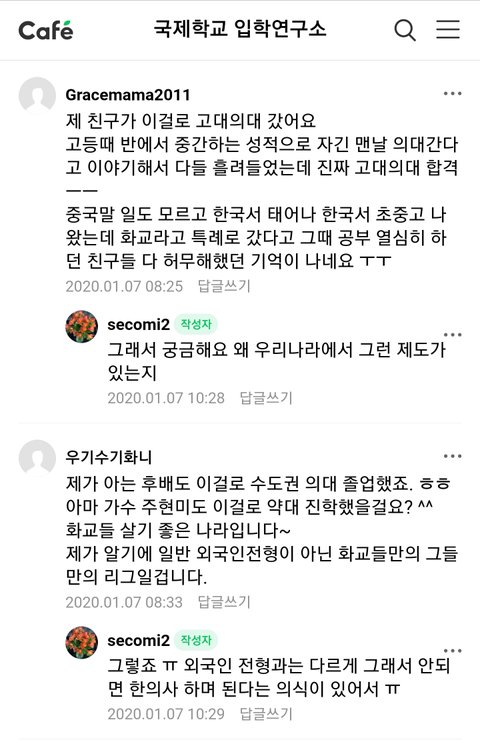 중국인이라는 이유로 의치한약수 쉽게 가는거 진짜 소름이다 ㅋㅋ 한국인들은 죽어라 노력해도 가기 힘든데