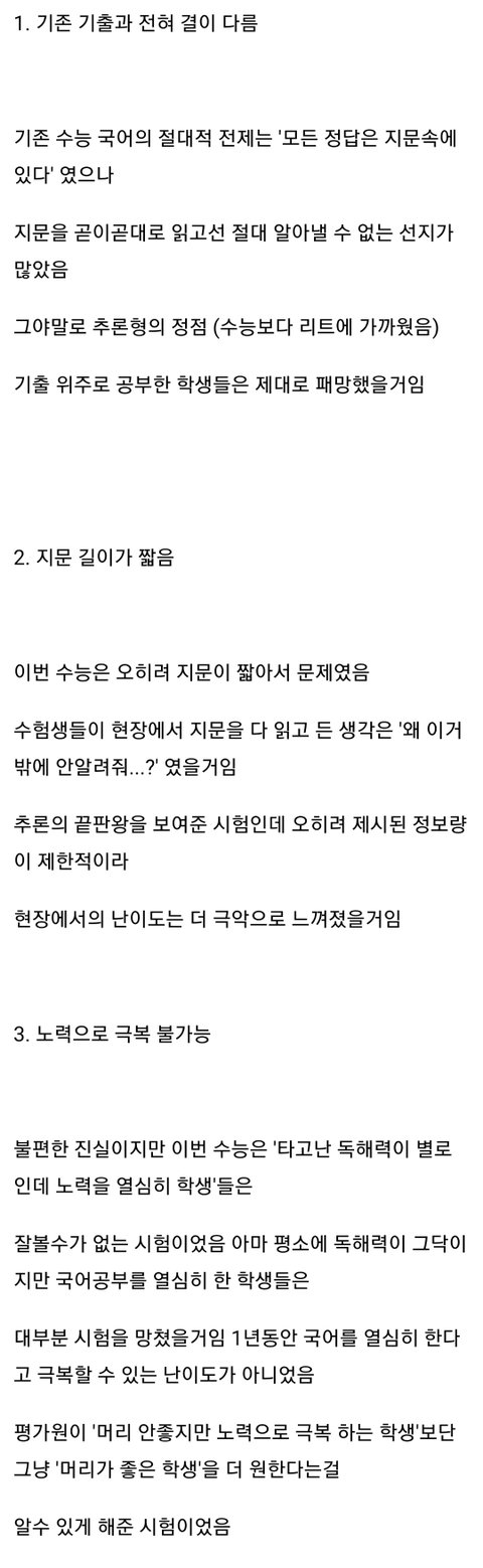 애초에 대학수학능력시험은 대학가서 공부 할 능력이 있는 지를 보는 거임 즉 모든 수학의 기초라 볼 수 있는 문해력이나 추론이 안되는 사람이 대학가서 학문을 수학 할 수 있겠음? 어떻게 보면 수능이 이런 기조로 나와야 하는 것이 이상한게 아님 대학은 어떤 학문에 대한 실제조사나 학술연구에 대해서 심도있게 배우는게 목적인거지 우리나라도 외국처럼 4년제 학위는 학문을 수학하는 사람들이 가고 취업을 위해서는 2-3년제 기술 전문대학 비중으로 두는 게 맞음 앞으로 이런 기조는 이어질거라고 봄