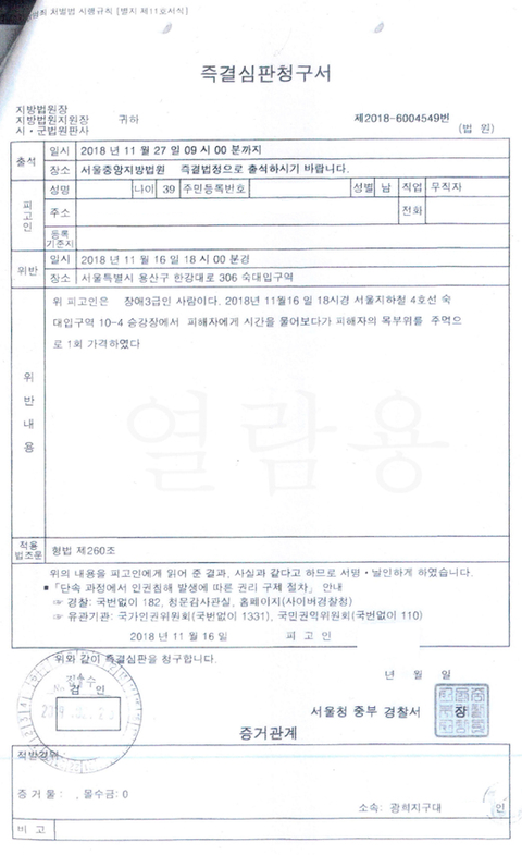 그 당시에 경찰이 가해자를 정식으로 피의자로 입건하지도 않고 피의자 신문조서도 작성하지 않고 검찰로 송치하지도 않고 즉결심판으로 넘긴다고 해서 제가 강하게 처벌해 달라고 이의를 제기하고 항의했으나 경찰은 즉결심판으로 넘기는건 법적으로 문제 없다고 하며 솜방망이 처벌 절차를 진행했습니다.