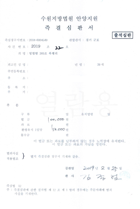 참고로 저는 민사 손해배상 청구에 필요하니 위 서류(즉결심판 청구서, 즉결심판서)를 발급해 달라고 했으나 경찰이 즉결심판 사건은 내부 규정상 비공개라면서 발급을 거부해서 제가 법원에 소를 제기한 후 문서송부촉탁 신청(해당 문서를 법원으로 보내달라는 신청)을 해서 경기군포경찰서에서 법원에 제출한 자료를 소송기록 열람ㆍ등사 신청을 해서 입수한 자료를 여기에 올린 것입니다.