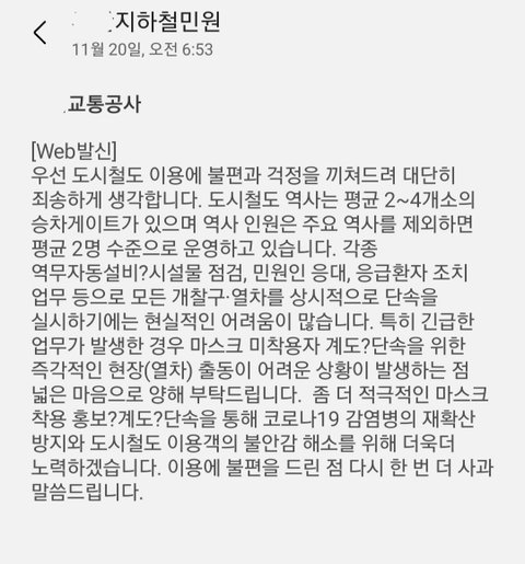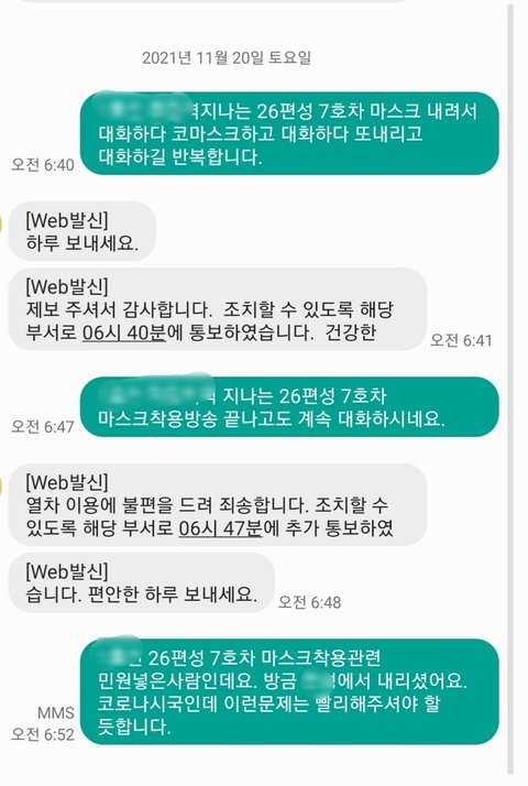 am 6:40 첫번째 문자민원-> 6:40~41 해당민원접수 -> 6:43 마스크 착용 지하철객실 안내방송