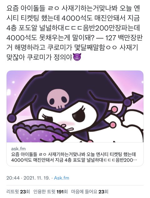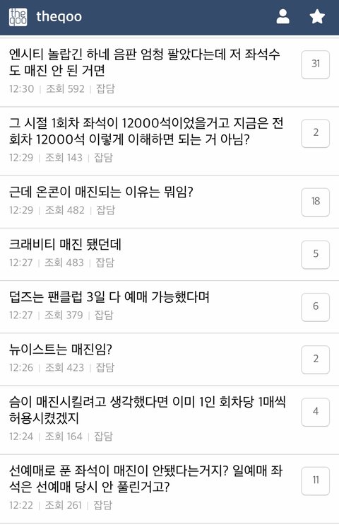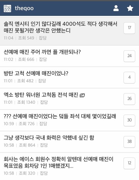 음반 300만장 팔았다면서 첫 고척 오프 콘서트 세시간동안이나 플로어 매진도 못시키고 뒷줄 개텅텅이라 지금 난리났음... 왠일이여 이래서 음반 사재기 못믿겠다니까