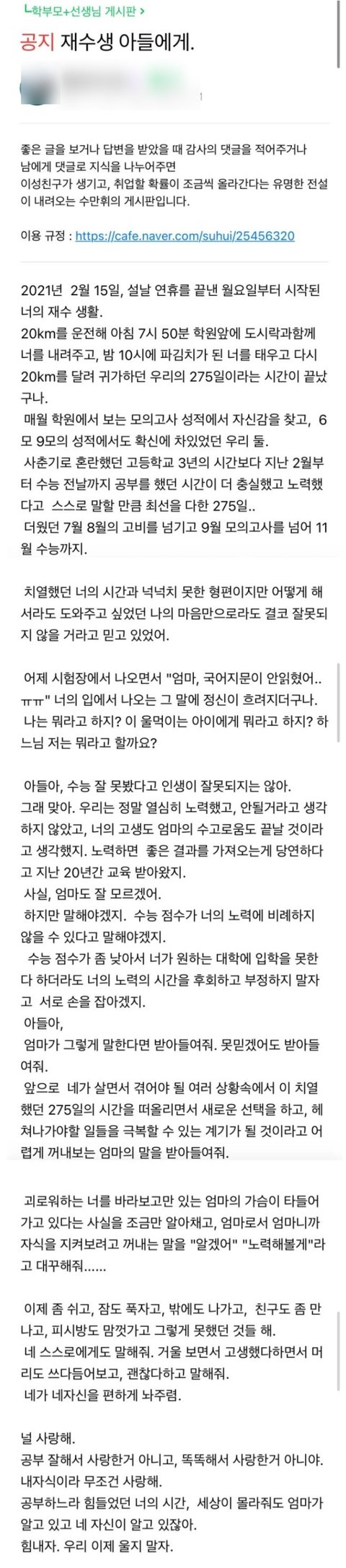 수만휘에 올라온 재수생 아들에게 쓴 글
