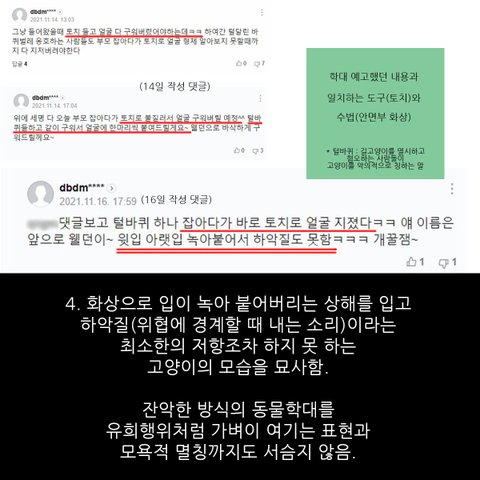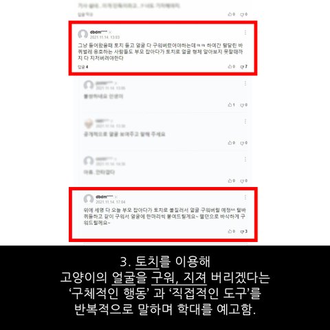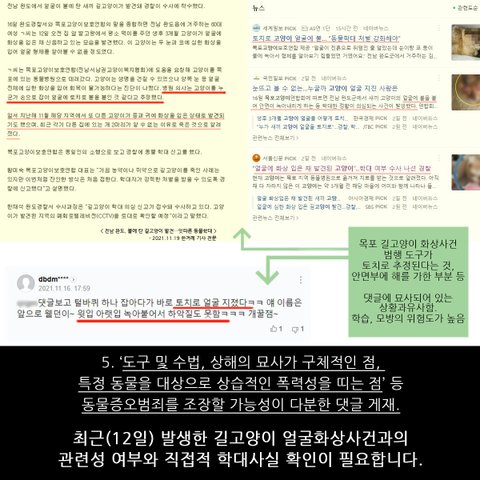 안녕하세요. 최근 고양이 토치 화상 사건과 관련해서 동물학대가 의심 되는 댓글을 발견했습니다.한 건이 아니라 상습적으로 같은 내용의 댓글을 고양이 기사마다 찾아 다니면서 달아 놓았는데실제 발생했던 사건과 연결 지어서 경찰 수사 요청을 할 수 있는지, 그리고 동물보호법 위반으로 처벌 가능한지 봐주셨으면 합니다.