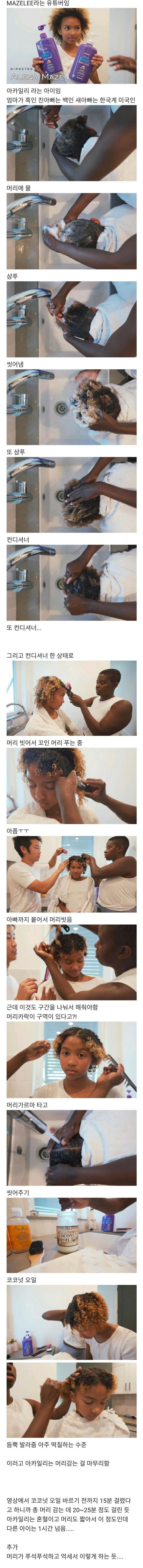 흑인 여자형사 친구 있는데, 점심 먹으면서 애들 얘기 하다 머리 얘기. 어린애들은 가닥가닥 갈라서 묶어 줌. 안그럼 엉켜서 아프로 머리처럼 부풀어서. 밤에 잘때 묶은 자리 아파서 우는 애들 많음. 요새는 엉킴방지 스프레이 많이 나오는데 솔직히 그걸로 어림 없다함. 좀 크면 직모펌도 많이 하는데 것도 여긴 정말 비싸고. 직모 샴푸도 있다는데 별 효과 없고. 많이 힘들어 보임.