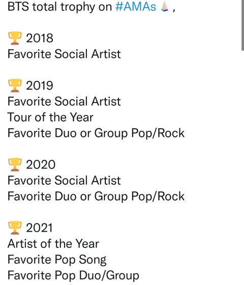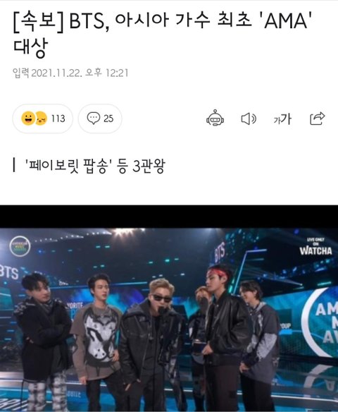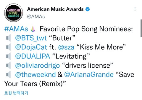 2021년 아메리칸 뮤직 어워드(미국 3대 시상식 중 1)에서 방탄 3관왕