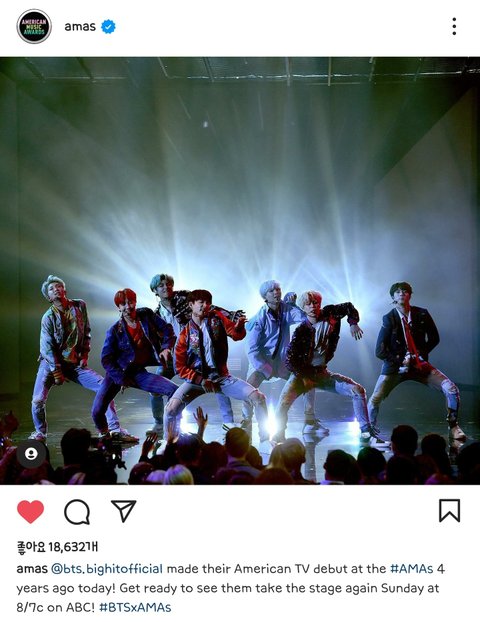 참고로 amas는 2017년 방탄이 미국에서 처음으로 한 데뷔무대였음.