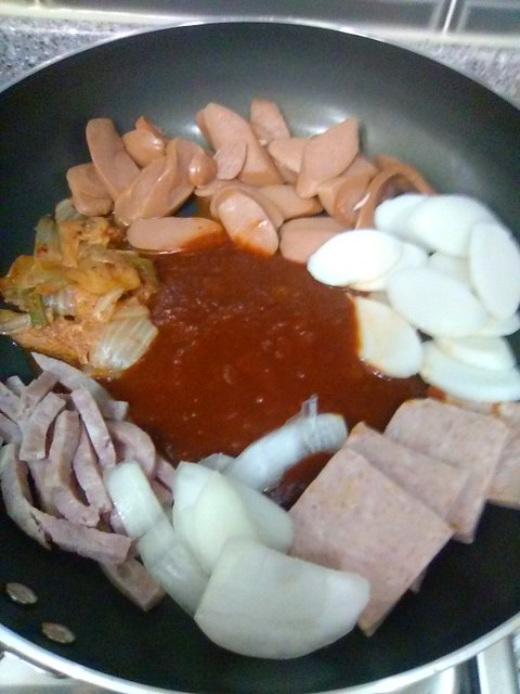 모든 재료가 준비되면 재료들을 이쁘게 후라이팬에 담아주세요 ^_^(아 참고로 저 가운데 있는 건 시판용 부대찌개 소스 ^_^a.. 부대찌개 소스 레시피를 잘 몰라서.. 다음엔 제가 직접 만들어 볼게요 ^_^..)