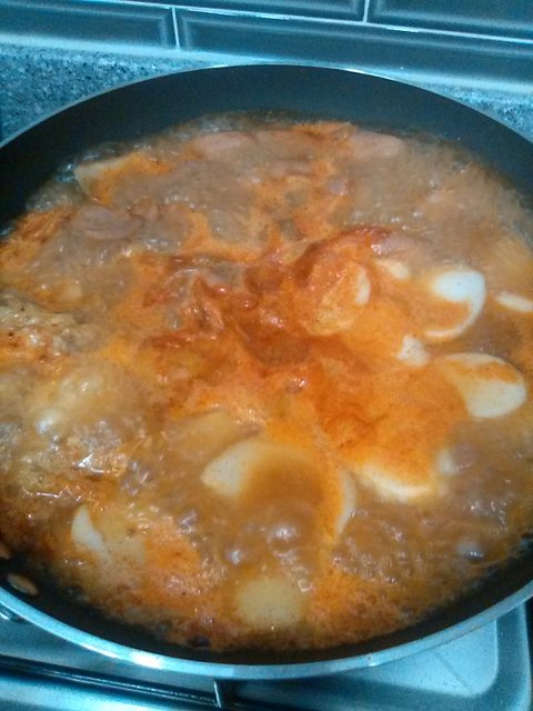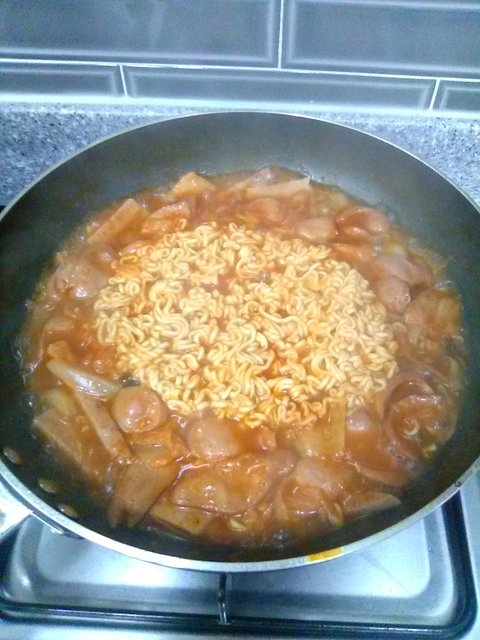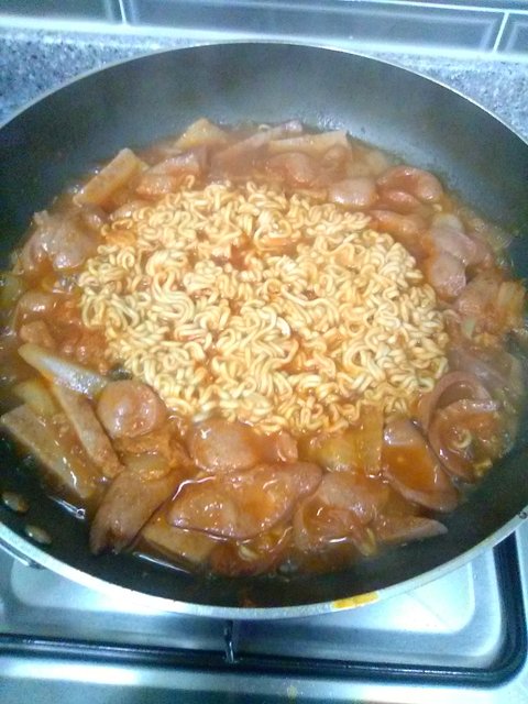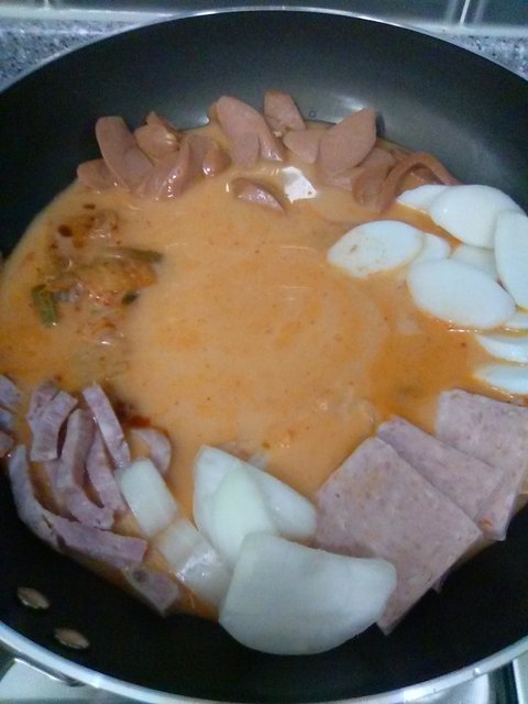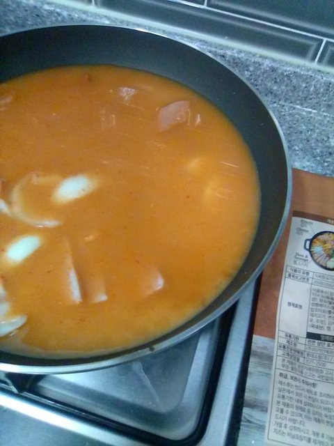 ..이제 부대찌개를 보글보글 끓여주기만 하면 하는데 거의 한강 수준이네요..^_^..좀 오래 끓여볼게요(중간에 떡이 다 익었을 때 동생한테 먹였어요 ^_^v 제가 저 떡을 별로 좋아하지도 않아서..^3^..)