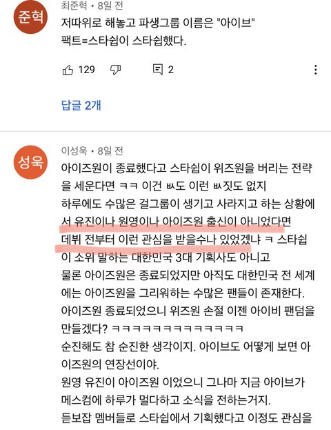 유튜브에 떠서 보는데 댓글들 다 이런 내용밖에 없음 그리고 안유진 장원영 무시 개쩔어 ㅋㅋㅋㅋㅋㅋㅋ 아이즈원 아니었으면 관심 못 받았다 ㅇㅈㄹ… 걍 안녕즈 싫어하던 애들이 이번에 건수 잡아서 아이브 괴롭히는듯 진짜 왜저러냐