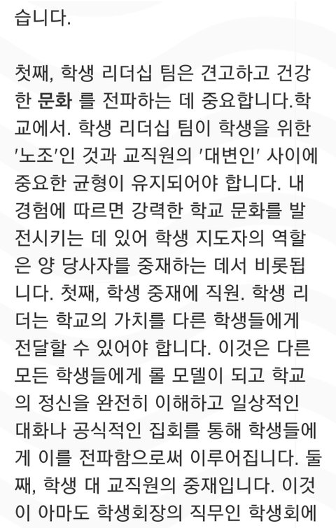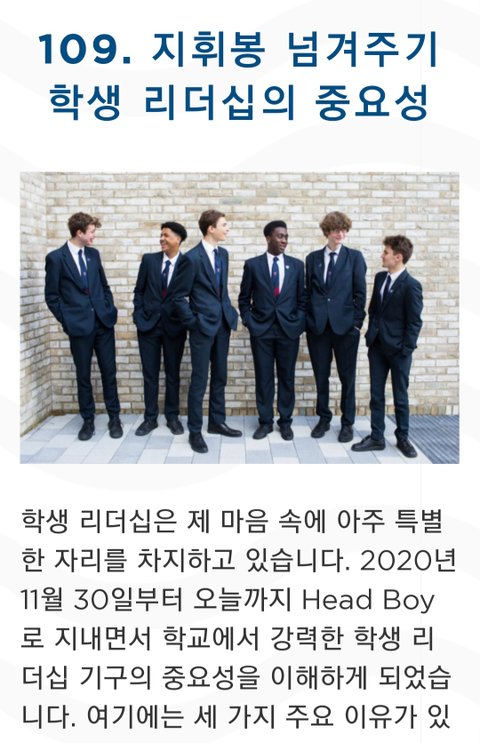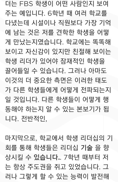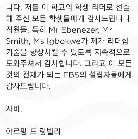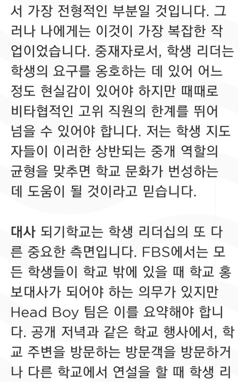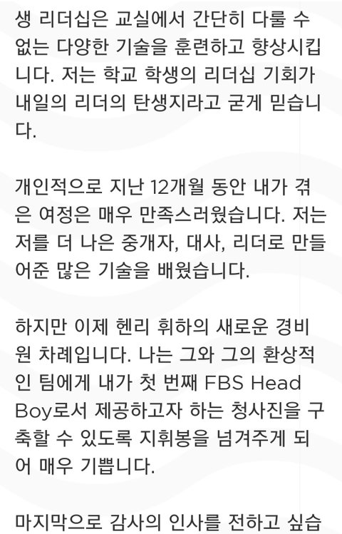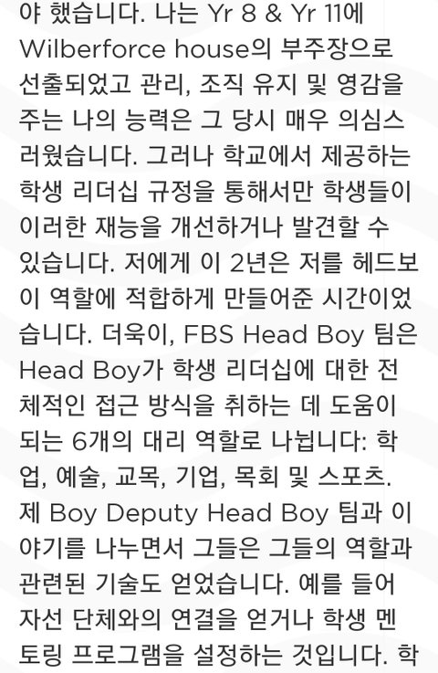 8학년 11학년 때 윌버포스 하우스의 부대표를 했고 그 경험들이 회장 되는데 많이 도움이 되었다 근데 많이 부족했던 부분들은 리더쉽을 발휘할 수 있는 여러 활동에서 배웠고 헤드보이팀과 대화하면서 많이 발전했다는 거... 풀햄 학생 모두는 학교 밖에서 풀햄 홍보대사가 되어야 한다 외부에서는 학생을 보고 풀햄이 어떤 학교인지 판단하므로 리더는 똑똑하고 자신있으면서도 친절해야 한다는 얘기인듯 마지막 인사말에 자비라고 된 거는 원문에 merci(고맙다)였음ㅎ