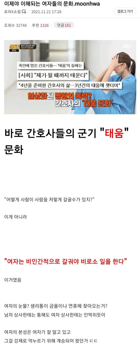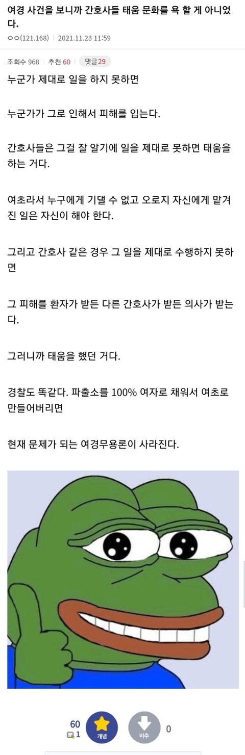 역시 이건 너무 간 거지. 일을 가르칠때 엄격하게 가르치는거 뭐 필요한 상황이 있을지도 몰라. 근데 태움은 일하라고 갈구거나 일을 가르치려고 갈구는것 뿐만이 아니잖아. 지금도 남아있지만 옛날에는 더 심했던 군대 부조리 행위 같은거지 옹호받고 그럴만했다 그런 수준의 문화가 아님
