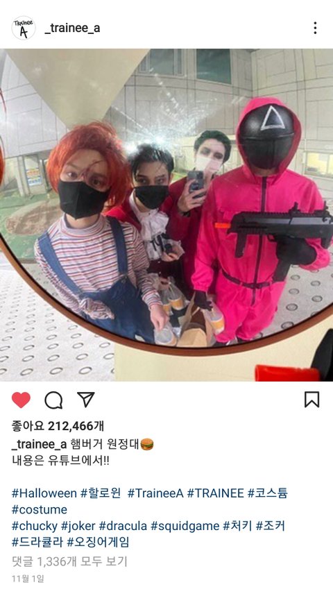 그리고 얼마 안 지나서 유튜브와 인스타에 오징어 게임 분장을 한 사람이 함께 올라옴