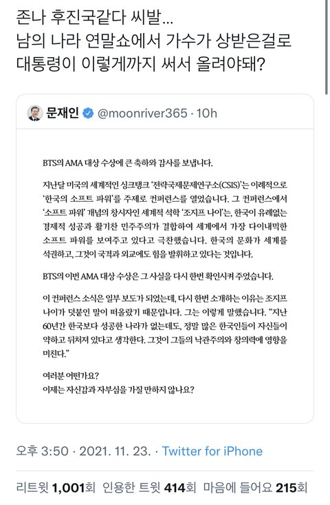 ㄴ이모든게 방탄 미국대상 받아서 문제인이 축전쓴것 때문에 그럼 일단 ama가 남의 나라 연말쇼라고 하는것부터 ㅂㅅ티 났는데 이럴 줄은 몰랐음 방탄 왜 이렇게 욕 먹음?