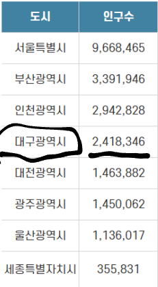 대구는 광역시이고 인구수 4위 대도시 어쩌고 하길래 ㅋㅋㅋ