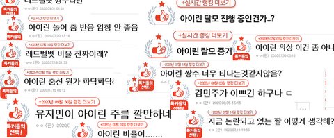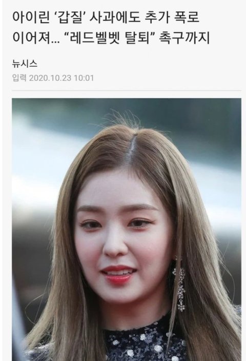 아이린이 안까였다고??? 갑질논란 바로 전에 그땐 한짓도 없는데 억까로 꾸준히 까였는데? 탈모 왔다고 머리 묶은걸로 까고 나이 많다고 30살이라고 늙었다고 까고 타돌이랑 엮어서 까고 피부 악의적으로 포샵한거 올려서 까고 비율이나 키로 작다고 까고 카페사진으로 코로나 관련 억까 여러번 하고 춤 빨리 돌려서 조롱하고 팔자주름 있다고 까고 누구 솔로 해야하는데 꼽사리 껴서 같이 나왔다고 까고, 진짜 일부만 가져와도 억까가 이정도인데 진짜 개소리네