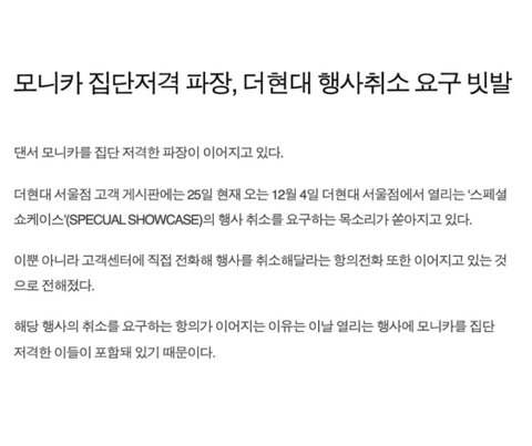 정신 못차림ㅇㅇ 이거 취소되어도 끝까지 피코하면서 모니카탓 할수 있을지 함 보자ㅋ 이게 끝이아님 스맨파에 나와도 끝까지 항의할거고 나가 떨어질때까지 괴롭힌다