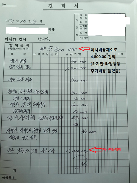 2) 견적서 480만원+추가비용 중 제대로 끝낸게 하나도 없음(돈달라고 찡찡거려 별일 있겠나 싶은 맘에 순차적으로 입금함)