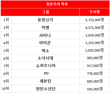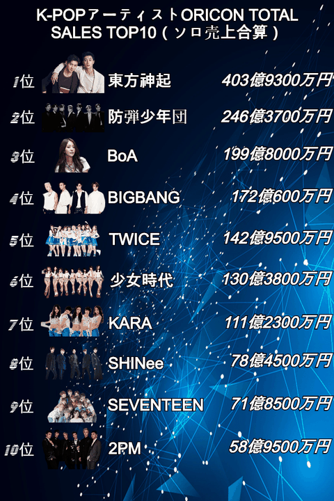 역대 한국가수 오리콘 통합 매출 403억 9300만엔