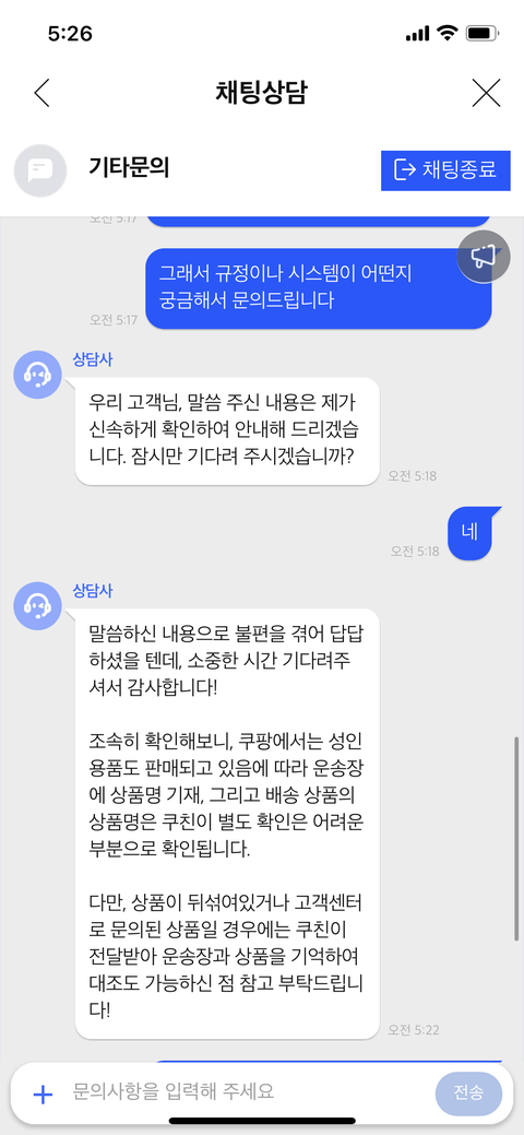 +)문의 사진 첨부했구여 성인용품아니구여 그러실 가능성 전혀 없다고 생각한다고 말 했구여. 그래도 그런 가능성을 생각해본 이유는 유사한 일을 전에 택배 통해서 겪어봤기때문이에요. 어쨌든 다수의 의견을 보니 전 ㅈㄴ 예민한 조현병자에 맞춤법이라고는 모르는 사람이라는 사실을 알게되었습니다! 앞으로는 직접 나가서 물건을 구매하는 사람이라도 되도록 노력하겠습니다..!
