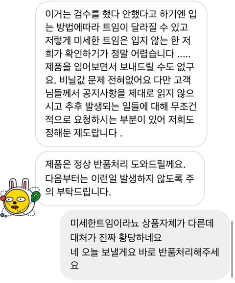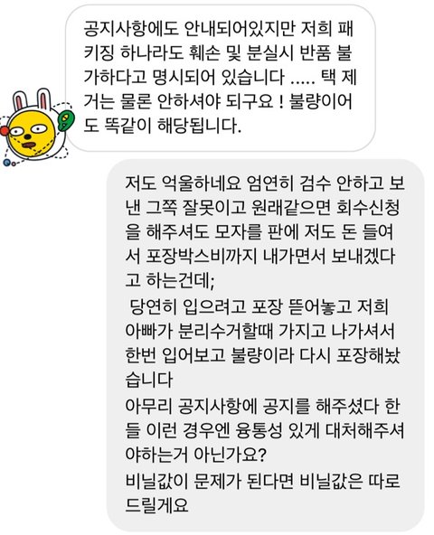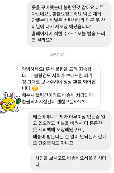 안녕하세요 제가 인스타 마켓으로 옷을 보고 구매를 했는데 불량 제품이 왔습니다.그거에 대해서 환불을 받으려고 문의를 드렸는데 대응이 이게 맞는건가요???....비록 패키징(비닐)을 버린건 제 잘못이고 인정합니다.그래서 제가 직접 포장해서 우체국가서 택배상자까지 사서 반품을 보내려고 하는데좋게 해결 할 수 있는 일을 이렇게 대응하는게 황당합니다. 제가 잘못 된건가요?..물론 정상 반품처리는 해준다고 했으나 괜히 제가 진상고객이 된 것 같고 죄인이 된 것 같아기분이 너무 안좋네요..