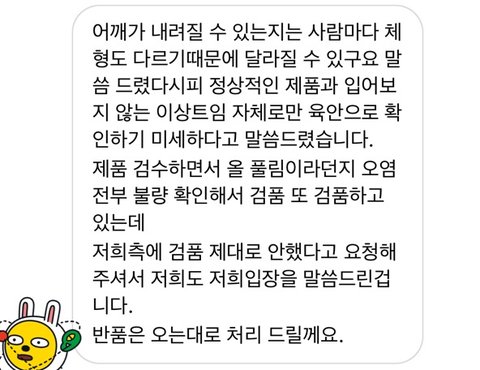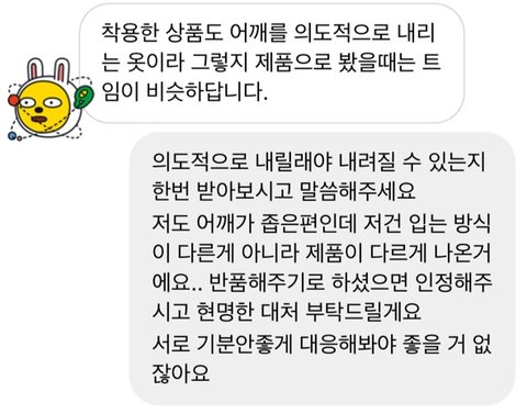 저도 어깨가 좁고 여리여리한편인데저건 거의 3배를 찢어야 사진처럼 입을 수가 있는 거 아닌가요?자꾸 진상고객취급하고 반론만하고 의견을 굽히지 않는 태도가 이해가 안갑니다.서로 언성이 높아지는거 같아 마지막엔 기분 서로상해할필요 없을거 같다고도 했는데끝까지 저렇게 왔네요
