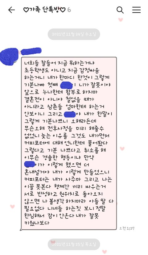 정말 어이없고 열받았지만 어머니는 그래도 동생이랑 같이 사는 며느리니 고맙다며 동생이 많이 부족하다며 답장을 보냈다고 하셨습니다.