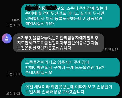 오토바이에 연락달라고 번호를 남겨놓던지, 종이에 뭘 적어뒀던지 했으면 제가 말없이 둬서 죄송하다고 했을텐데. 기분이 많이 상했네요.
