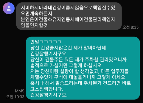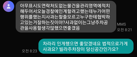 참고로 문자에 자기가 건물주니 뭐니하는데 여기 좀 오래된 4층?5층 빌라구요, 제가 월세내면서 자취하면서 사는데 월세내는 자취방 주인이 제 어머니입니다. 방하나를 샀는데 주차할 권리 당연히 있는걸로 알고 있습니다.