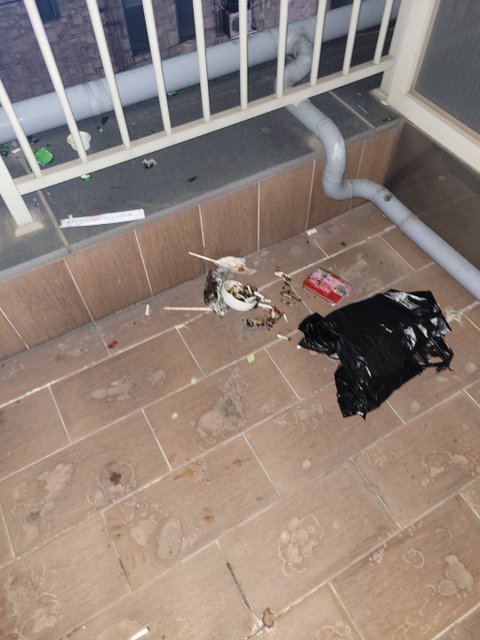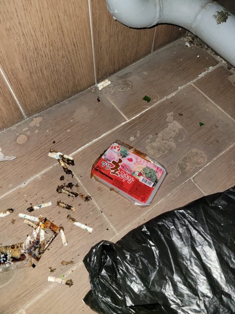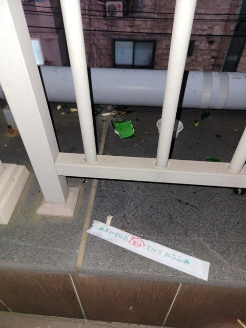 동생이 밤에 갑자기 밖에서 쿵소리가 나서 베란다 문을 열어보니 깨진 소주병 조각, 담배꽁초 든 유리 재떨이가 깨져있고 초고추장과 쓰레기들이 널브러져 있었습니다.