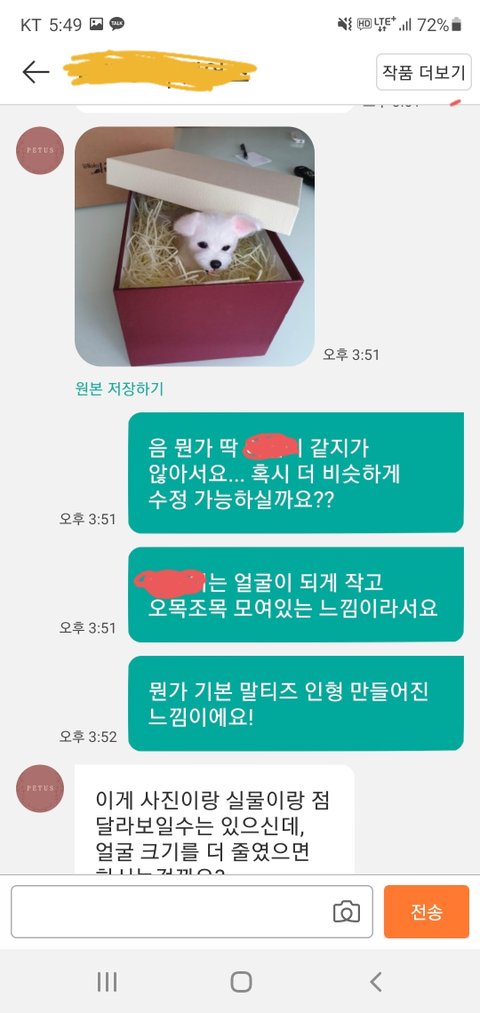 작가님은 8월 30일날 완성 사진을 보여주셨고 저는 실물과 너무나도 거리감이 느껴지고 그냥 저희 강아지가 아닌 보통의 말티즈 인형같은 느낌이 들어 사진과 같이 말씀드렸습니다.