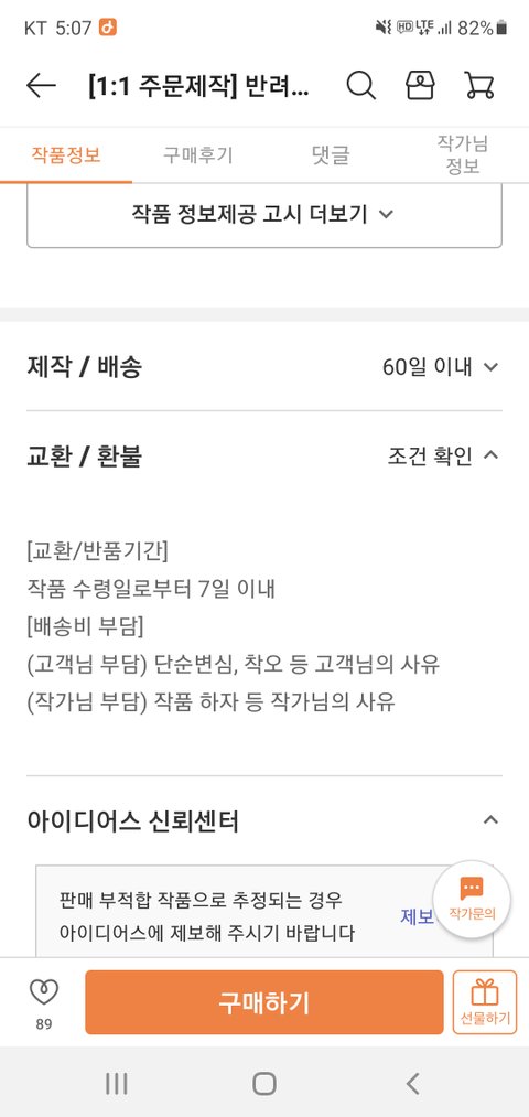 결국 작가님께 너무 마음에 안들고 사진이나 실물이나 똑같고 제품도 불량한 상태로 왔으니 환불을 부탁드린다고 제품은 다시 보내드리겠다고 했습니다. 하지만 작가님은 주문제작은 환불이 어려움이 있다 하셨고 작가님의 주문 게시글 하단을 찾아보니 환불은 작품 수령일 7일이내 작품하자 등 작가님의 사유로 가능하다 되었습니다.