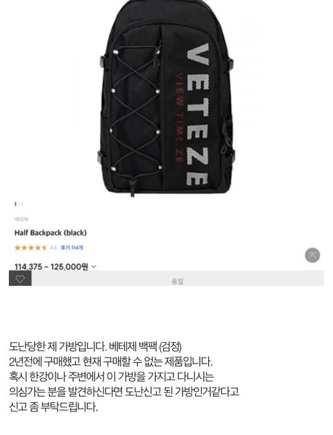 도난당한 제 가방입니다. 베테제 백팩 (검정)
