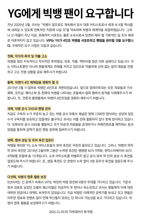 빅뱅 팬 연합은 “5년이라는 긴 공백기 속에서 우리는 여전히 빅뱅 완전체 4명의 무대를 기다리고 있다”고 말했다. 이들은 멤버 생일 및 뮤직비디오 축전 업로드와 빅뱅의 향후 활동을 보장하고 이를 약속해달라고 호소했다.