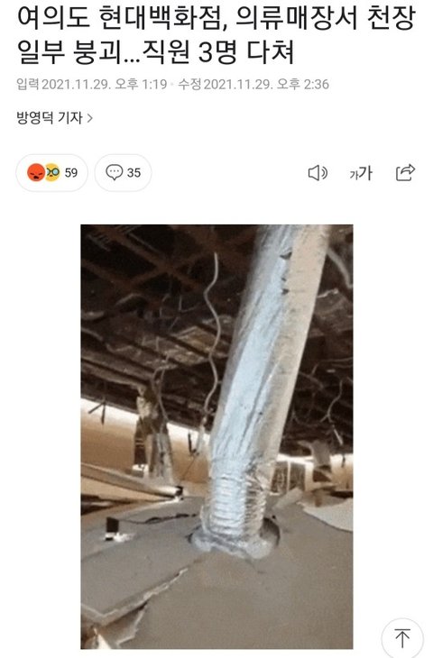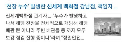 크게 다친 분은 아무도 없어서 다행임ㅜㅜㅜ 아니 삼풍백화점 무너졌던 나라에서 하필 백화점에 이런 일 생기니깐 괜시리 불안함 +) 지난 달에는 신세계에서 천장에 물 샜었대 이게 머선 일인가 싶고