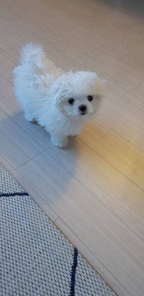 3개월된 미니 말티즈 우리집 구름이 입니다 첨 데리고 왔을때 넘 작아서 잘 보이지도 않았네요 ㅎㅎ 무럭무럭 자라서 이제 제법 통통해지기도 ^^ 넘 귀여운 구름이 자랑해보아요♡