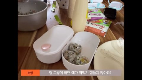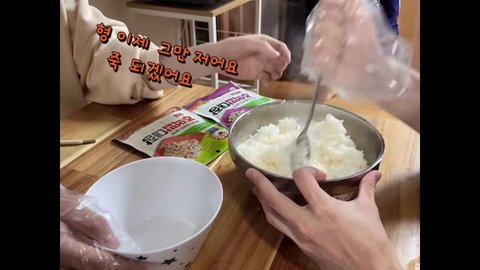 갓 지은 밥이 너무 뜨거운 아빠와 밥 뭉개질까봐 걱정되는 엄마