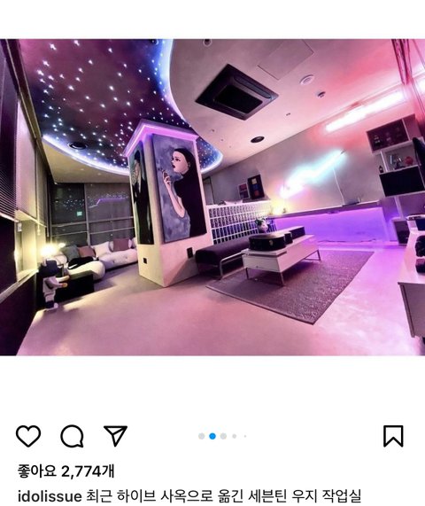 일단 여기 댓글 보면 오해 생길 것 같은데 방탄도 메인 프로듀싱 및 외부 작업까지 전멤버가 다 프로듀싱 굉장히 깊게 하는 아이돌임 그중 슈가는 진짜 비트하나하나까지 다 짜는 프로 프로듀서고 수란 아이유 헤이즈 등등 유명한 노래 많이 프로듀싱함 하루에 한곡씩 만드는 사람임. 세븐틴 우지나 방탄 슈가나 둘 다 굉장히 뛰어난 프로듀서들이야. 마치 방탄은 작업 안하는 듯한 댓글이 있어서 그 부분은 짚고 넘어가자고. 그리고 원래 프로듀서들은 소리 울리는 문제도 그렇고 여러가지 요소 때문에 아주 큰 방을 쓰진 않아. 반면 저 방은 우지 본인이 원해서 요청 한 것 같음 방탄도 요청하면 저 정도 사이즈는 주겠지 하이브 건물이 다 방탄 돈으로 지어진건데. 그리고 댓글 버니까 우지님은 다른 프로듀서 분이랑 같이 쓰신다는걸 보면 충분히 그럴만 하다고 생각함. 아미들은 전혀 신경 안 쓰니까 아미 캐럿 이간질 하지 마셈 우지님은 늘 좋은 노래 계속 해서 만들어 주시길 댓글 더 늘리지 마셈