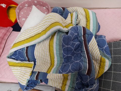 이불속으로 들어갈려고하는 도칠이.