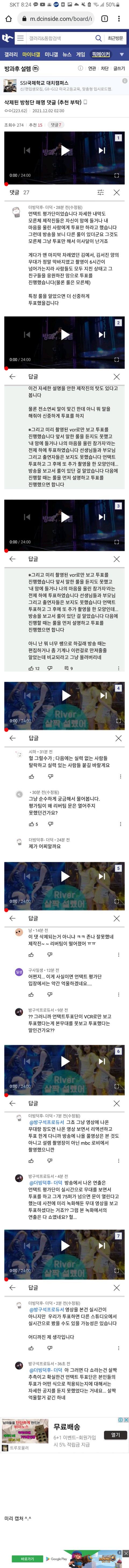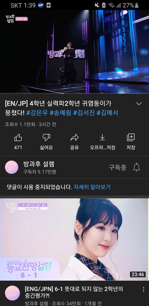 mbc의 새 아이돌 서바이벌 방과후 설렘 1화중 가장 문제가 됐던 무대(대충 요약하면 실력있는 팀은 떨어지고 무대가 심각하게 수준이 낮았던 팀이 그냥 웃기다, 귀엽다 는 이유로 1차합격함)의 영상의 댓글이 막히는 일이 있었는데