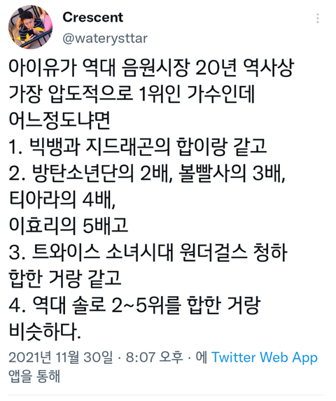 아이유가 역대 음원시장 20년 역사상 압도적으로 1위인 가수라는데 어느정도냐면