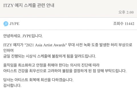 JYP엔터테인먼트 측은 "ITZY 예지가 '2021 Asia Artist Awards' 무대 사전 녹화 도중 발생한 허리 부상으로 인하여 금일 진행되는 시상식 스케줄에 불참하게 됨을 알려드린다"고 밝혔다.