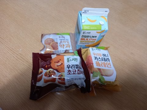 바나나 우유 작은거, 약과 하나, 머핀 하나, 카스테라 하나...