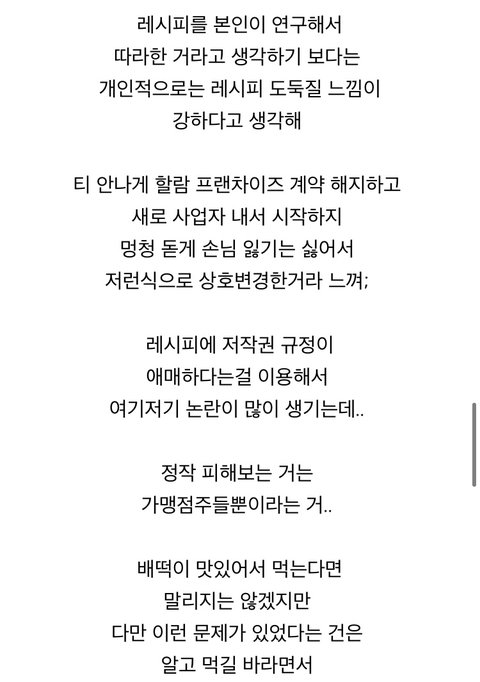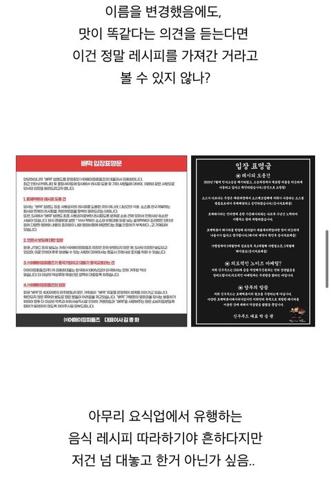 남산돈가스 원조 논쟁도 그렇고 덮죽도 그렇고 자꾸 원작자 출처를 불분명하게 흐려두고 빼앗겼는데 그거는 확실하게 재조명이 되고 많은 사람들이 아는 이유 - 방송에 출연했기 때문이라고 생각함… 이거 이렇게 묻히면 안 될듯 방송국이 연락 안 하나.. 지금 이 순간에도 우리가 모르는 다른 프랜차이즈 브랜드가 사실은 레시피나 원조 분쟁 훔쳐서 장사한다는 거 생각하면 가맹점주들만 불쌍해짐…