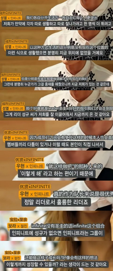 개개인적으로 튀기보다 팀을 더 생각하도록 중재를 잘해준다는게 어떤 부분인지 팬들이라면 다 알거임. 지나간 얘기지만 어떤 멤버가 연기를 시작한후 약간이라도 샐거같으니 바로 너는 배우가 아니니 인피니트로 돌아와라 라고 다잡아준 일화거나 본인이 개인활동을 할때도 항상 "인피니트"의 성규입니다 라고 자신을 소개하는것만 봐도 개인보다 팀을 더 생각한다는게 충분히 느껴지고 또 리더로서 모든 멤버들이 그렇게 하도록 엄격하게요구한다는게 느껴짐. 또 그렇다고 해서 개인활동을 지지 안하는게 아님. 멤버가 뮤지컬을 하든 솔로활동을 하든 연기활동을 하든 현장에 가장 많이 나타나는게 성규고 사비를 털어 스텝들한테 먹을걸 쏘는것도 성규였음. 정말 멤버 개개인한테 관심이 없으면 아무리 리더라도 이렇게 할수 있을가?