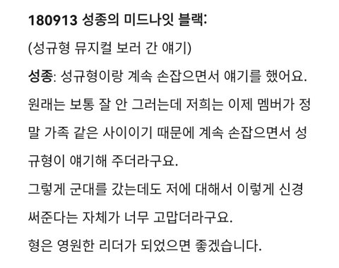 90도 인사가 몸에 배여있는 성규의 인성은 뭐 두말할것 없지 않나? 항상 츤데레처럼 멤버들과 팬들을 챙기던 성규지만 군대 갔다와서 더 유해지고 더 표현하려고 하는 느낌? 사실 일찍 입덕한건 아니지만 팬으로서 성규는 인간적으로 참 단단한 사람이라고 확 느껴졌던게 군대갈때 본인이 콘서트에서 직접 말해줬을때. 회사가 어떻게 일하는지 팬들은 당연히 다 알테고 본인도 그런 팬들의 심정을 어느정도 알고 있었을텐데 회사와 상의하지 않고 본인입으로 팬들한테 소식을 전하겠다는 결정을 내렸다는게 너무 고마웠고 성규에 대한 믿음이 더 단단해졌던 순간이였음ㅠㅠ 그리고 성규답게 끝까지 눈물을 안 보였던것도... 데뷔초부터 본인은 리더라서 동생들앞에서, 팬들앞에서 눈물을 보이면 안된다는게 자연스럽게 의식속에 배였는지 진짜 데뷔하고나서 성규의 눈물을 상류사회때 빼고 본적이 없음. 근데 가끔은 울음을 참으려 일부러 더 웃고 장난치는 모습이 더 마음이 아픈데 ㅠㅠ 이제는 멤버들한테든 팬들한테든 조금씩 천천히기대는 법을 알아갔으면 좋겠다 ㅠㅠㅠ